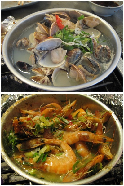 自製鍋物的教學:食材吧有一些自製菜色的教學,包括奶油金針菇、海鮮泡菜等,不過上面介紹的東西吸引不了我,後來我只弄下面這兩種鍋:蛤蜊湯與蒜頭蝦…水窪碳烤提供的配料(蔥、蒜、辣椒等)該有的都有,有創意的人不妨試試更多的作法。