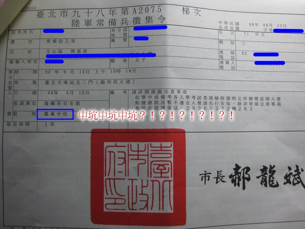 前幾天老闆非常錯愕的接了兵單,錯愕點有二,首先,原來收兵單之後兩個禮拜就要入伍;然後,新訓地點居然不是宜蘭金六結而是嘉義中坑…這是身為六分之一嘉義人的我也不知道在哪裡的地方…