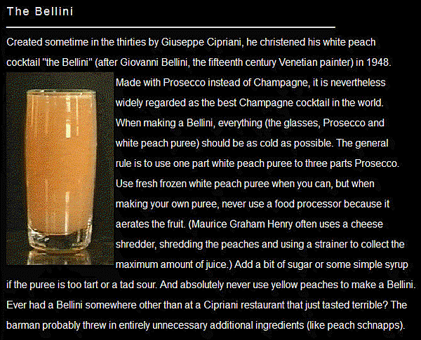 中文調酒書提到貝里尼,有些是寫白桃汁加氣泡酒,有些則是蜜桃香甜酒加香檳,東拼西湊,總之就是一個材料有桃一個材料有氣泡就好…