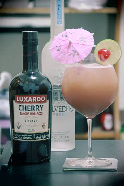 酒譜改編自《おもてなしカクテルレシピ》中蜜桃通寧。我個人很喜歡櫻桃的味道,因此炎炎夏日中,櫻桃口味的清涼冰飲就是我想要作製作的調酒。本來想要縮減茶香甜酒的份量,再加上一點BEEFEATER 24來加強酒精的強度,不過後來考慮到這是針對女性解渴清涼的第一杯調酒(還有老婆大人說不可以下手太重,否則她不喝...),因此保留原本的酒譜,將蜜桃香甜酒換成Luxardo黑櫻桃酒。