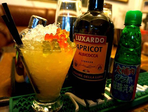 於是這次今夜我們喝調酒,我決定將小熊軟糖跟上次在攤位上喝的Valencia做一個結合,再加上彈珠汽水,做成一個復古又懷念的甜蜜味道,取名為"熊愛去𨑨迌" (𨑨迌=七桃) 。