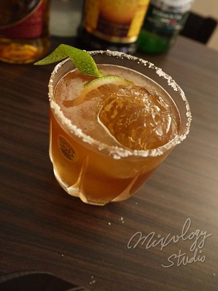 濾冰後倒入裝滿冰塊、沾有鹽口的威士忌杯中。